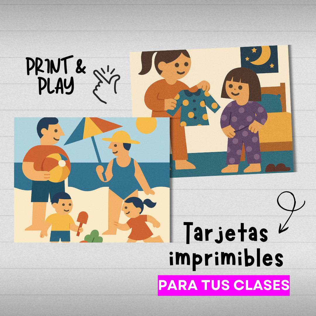 🛒 Supermercado •🍕 Pizzería • 🏖 Vacaciones • 🎉 Cumpleaños • 🐶 Veterinario • 🌧 Día de lluvia • ✂️ Peluquería • 🚌 Transporte público • 🧺 Picnic con abuelos • 🔧 Ferretería • 🚲 Reparando bicicleta… ¡y muchos más!